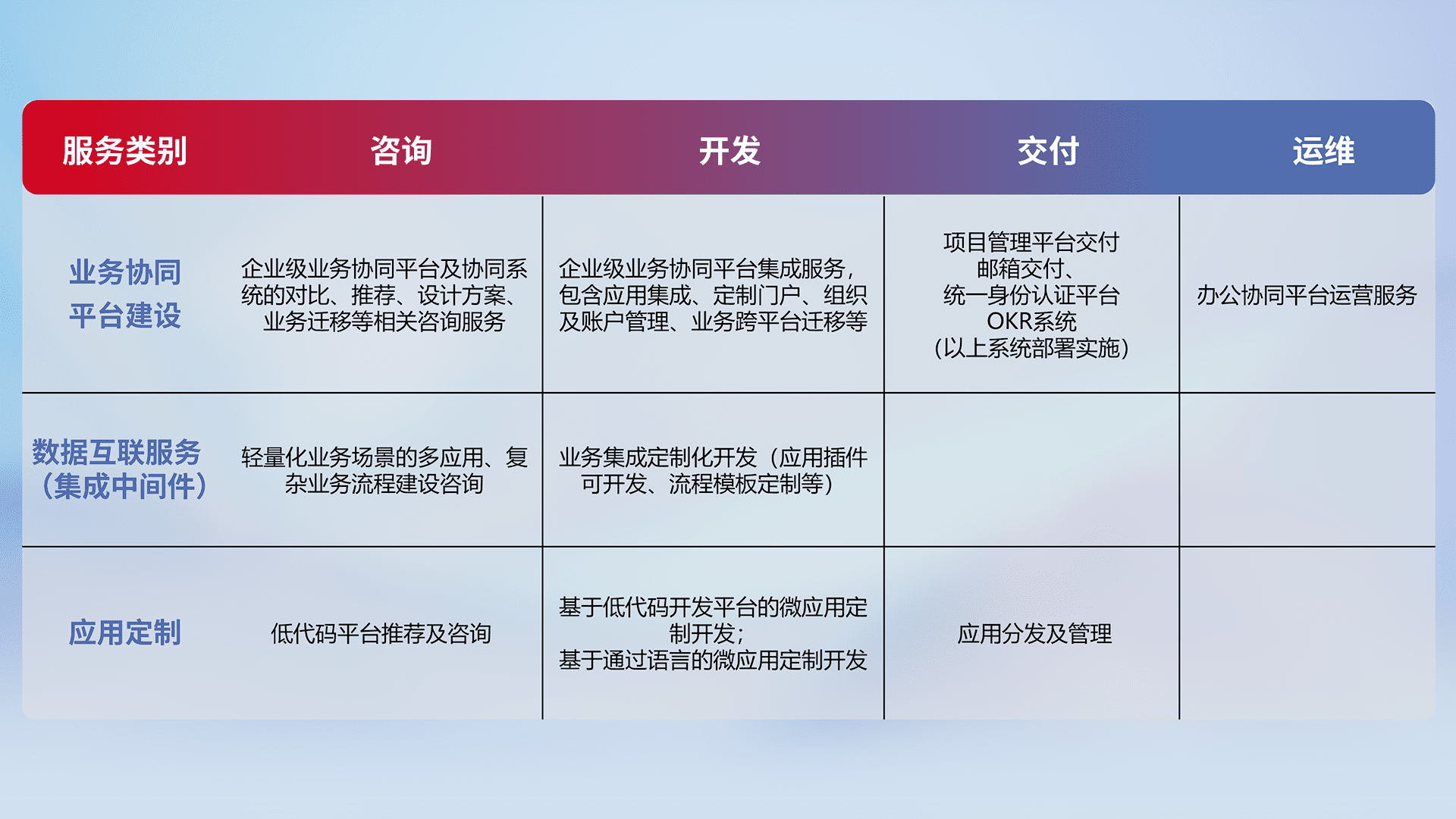 针对钉钉、、、、企微、、、IDaas等平台级产品提供产品的规划、、、方案、、交付、、、、定制化开发等服务,,,实现如统一协同办公、、、智能客户服务、、混合会议管理、、、、智能数据查询、、等业务场景,,实现数字化转型。。。。